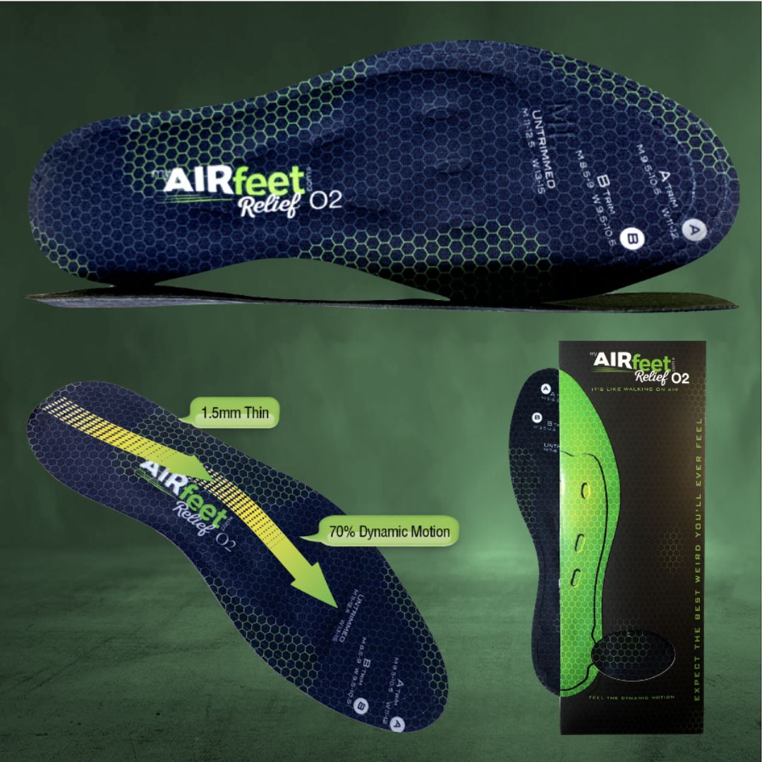 Supercharge your comfort with AIRfeet® RELIEF O2 Insoles, our latest “feather light” design that massages your feet for life-changing results. At a super thin 1-2mm when compressed, these insoles fit seamlessly into any footwear, simply slip them right in and experience: