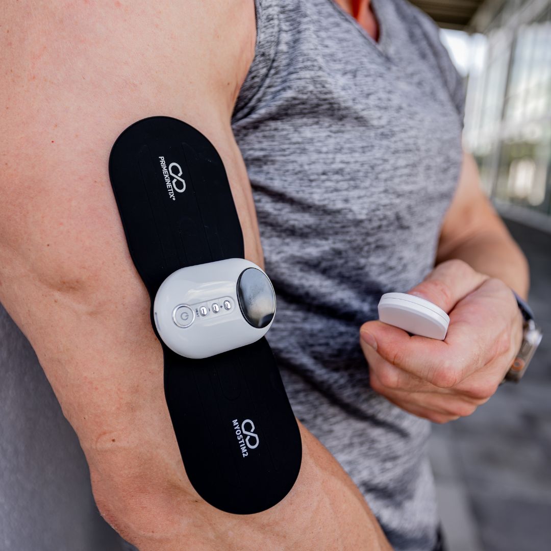The Myostim2® is powered by a lithium ion battery and charged with a USB-C charging cable (provided). It also includes a wireless remote control to allow ease of control over the settings once the device is set.